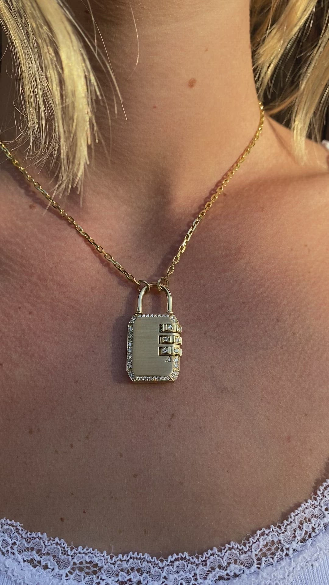This innovative pendant features a moveable dial and a unique "code" made up of Emerald and Turquoise stones. To unlock, simply align the stones with the triangle diamond markers on the front, and the pendant will click open. Attach it to your preferred chain, then realign the stones and gently push the top arch down to lock it in place. Spin the dials to scramble the code and secure the pendant on your chain.